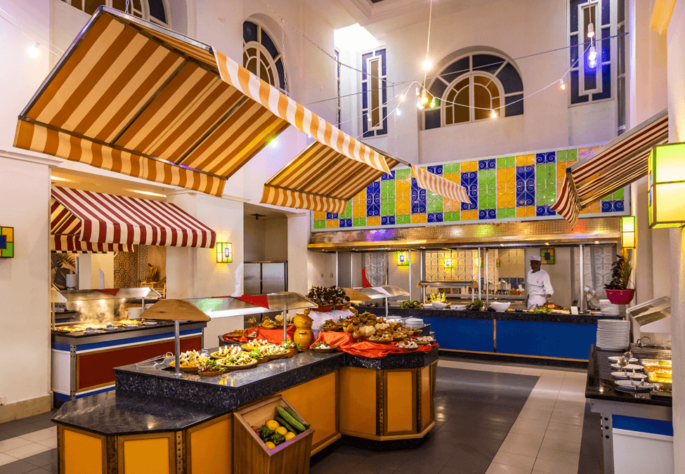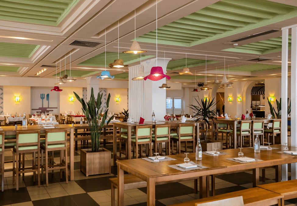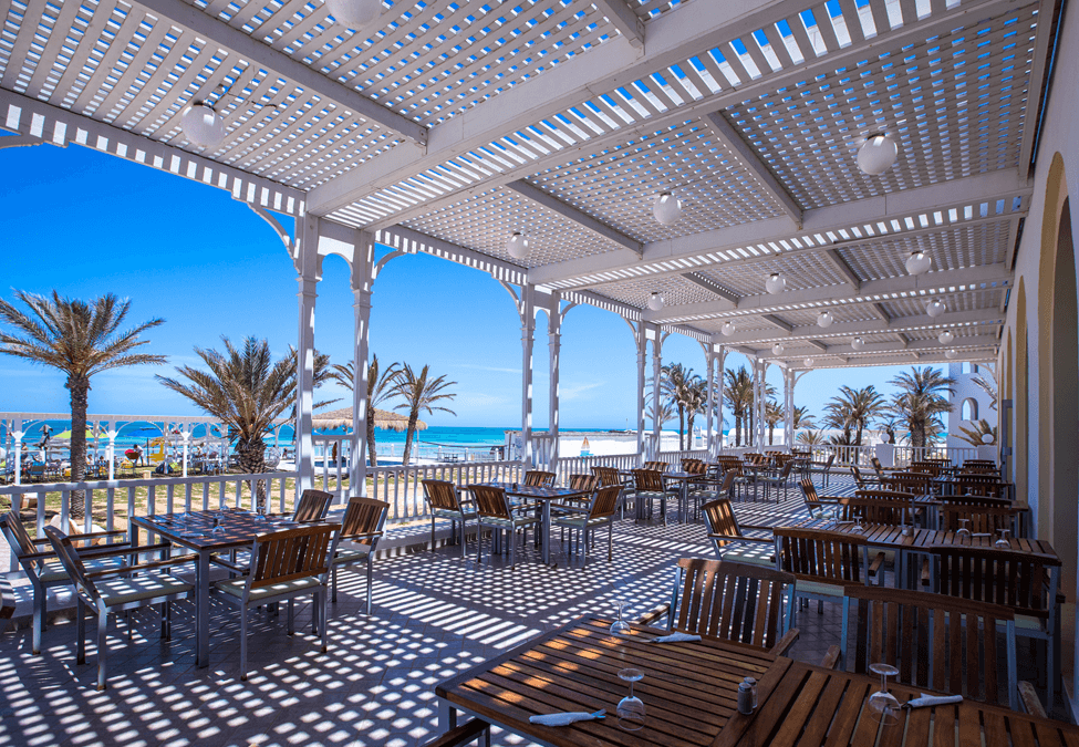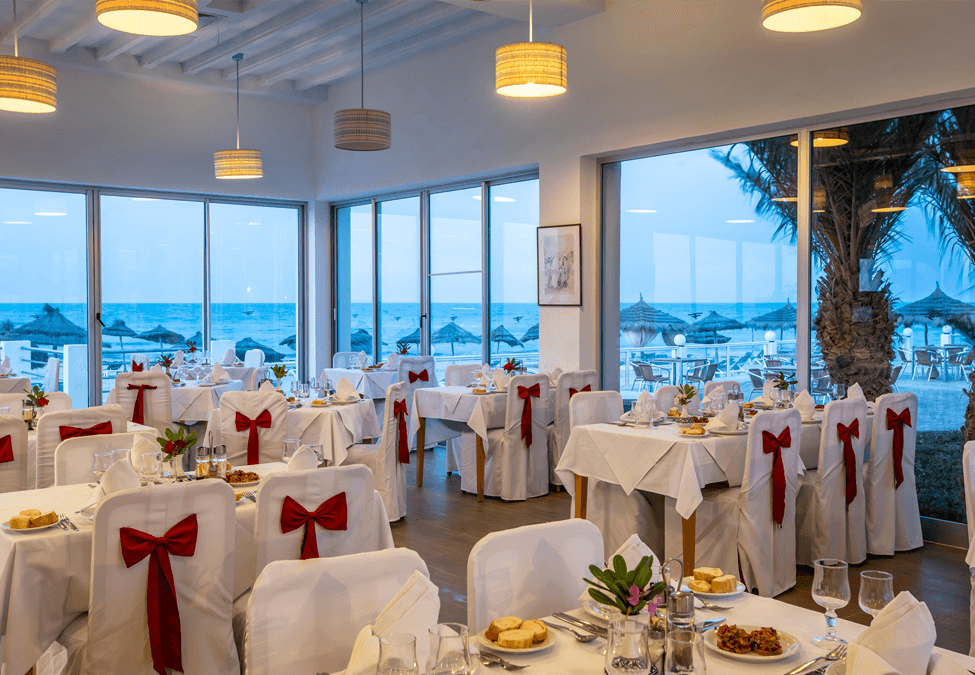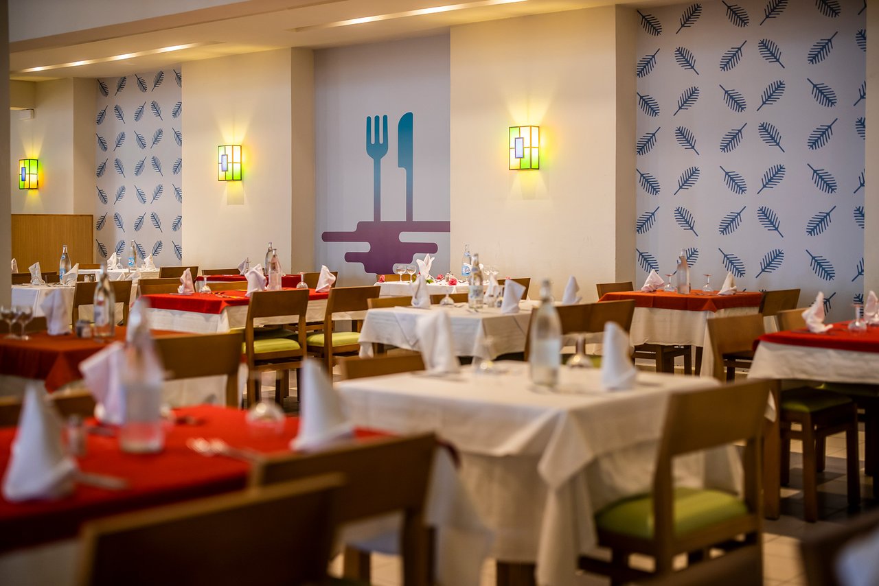 Restauration L'hôtel dispose de 1 restaurant principal avec repas sous forme de buffet de cuisine locale et internationale avec 3 dîners à thème par semaine, 1 lobby-bar, 1 snack bar piscine et 1 café maure, 1 restaurant à la carte (dîner).